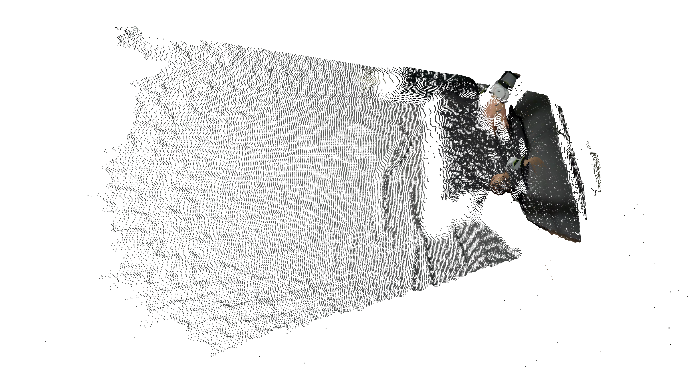Some EgoSuite episodes include 3D point clouds captured alongside human pose. These point clouds provide a dense representation of the surrounding geometry and can be used together with body/hand keypoints and camera images.