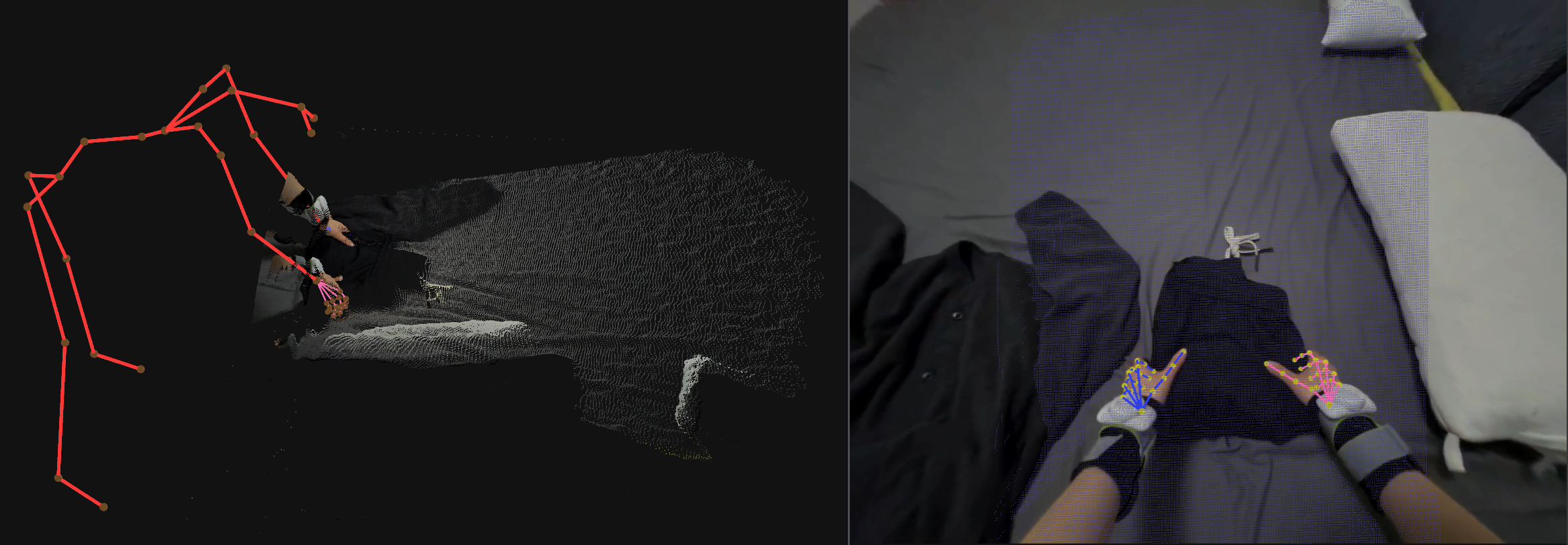 Right – corresponding head camera image with projected pointcloud and hand keypoints.